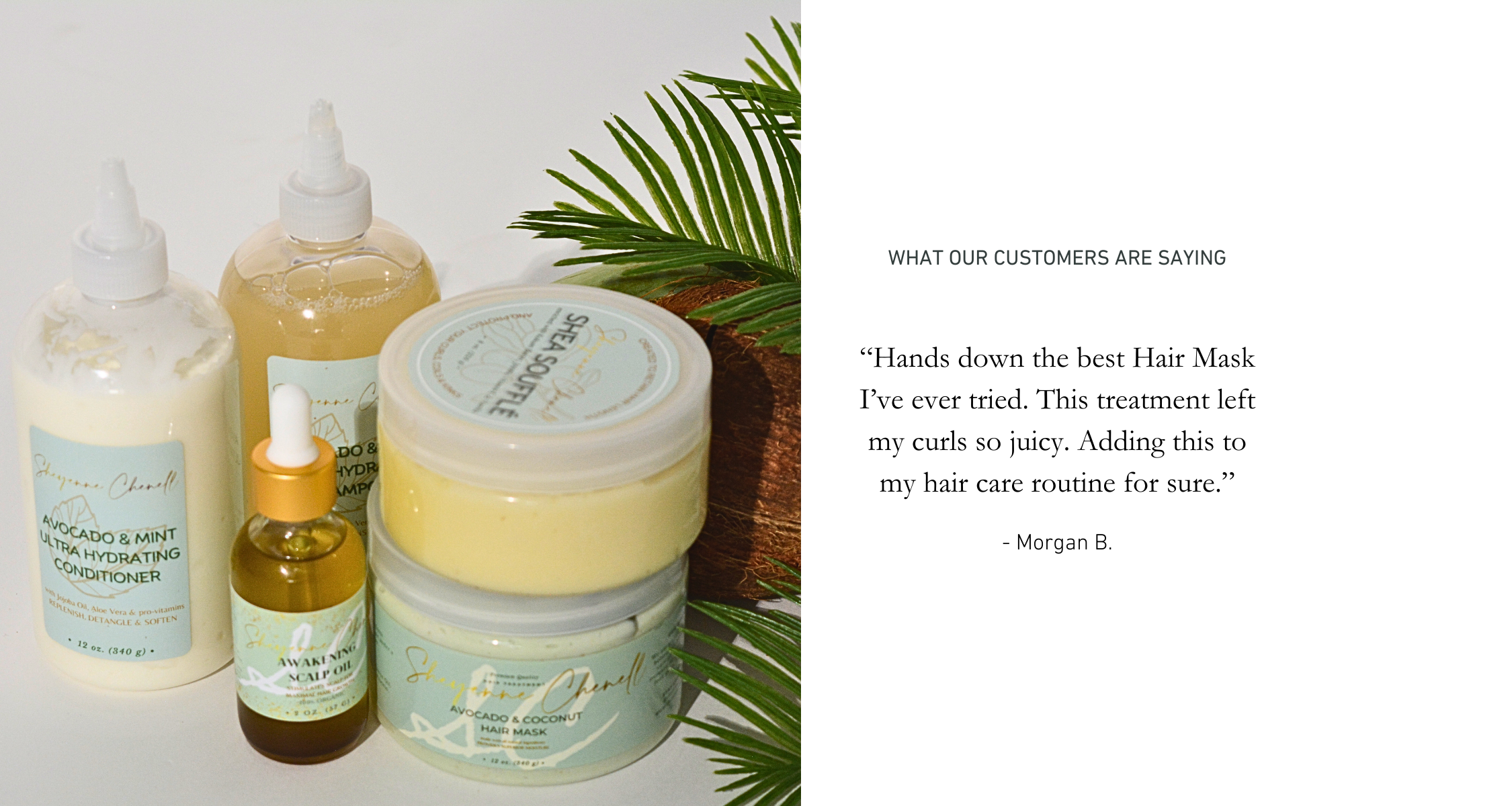 Explore our collection of high-quality hair care essentials, each crafted to meet the needs of several types of hair textures. With deeply hydrating ingredients like avocado, mint, coconut oil, and shea butter, our products work to lock in moisture, repair damage, and revitalize your hair.